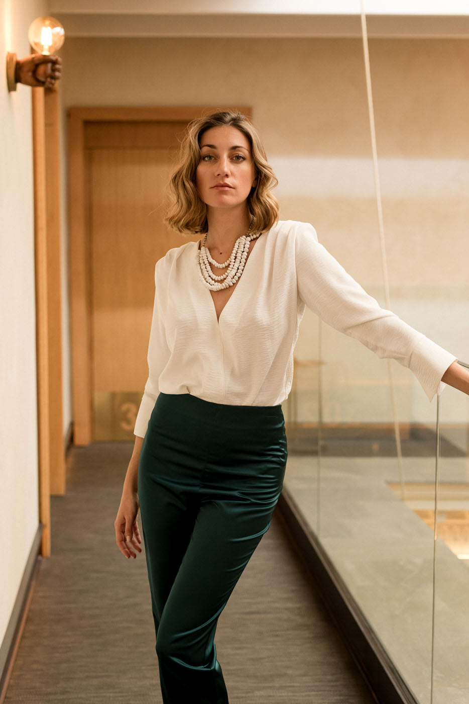 ELEGANCE AND FRESHNESS IN EVERY DETAIL The ALMA shirt stands out for its modern and versatile style. A white blouse with a flowing cut and V-neck , this design enhances the silhouette with its light drape and impeccable tailoring. Details like the pearl necklace add a touch of sophistication. Perfect...