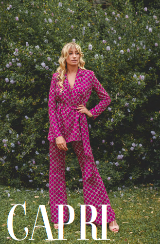 ELEGANCE AND RETRO STYLE IN EVERY DETAIL The CAPRI set stands out for its sophisticated design and vintage feel. Made from a flowing fabric with a geometric print , this design combines comfort and glamour. The double-breasted jacket with classic lapels flatters the figure, while the wide-leg trousers provide elegant...