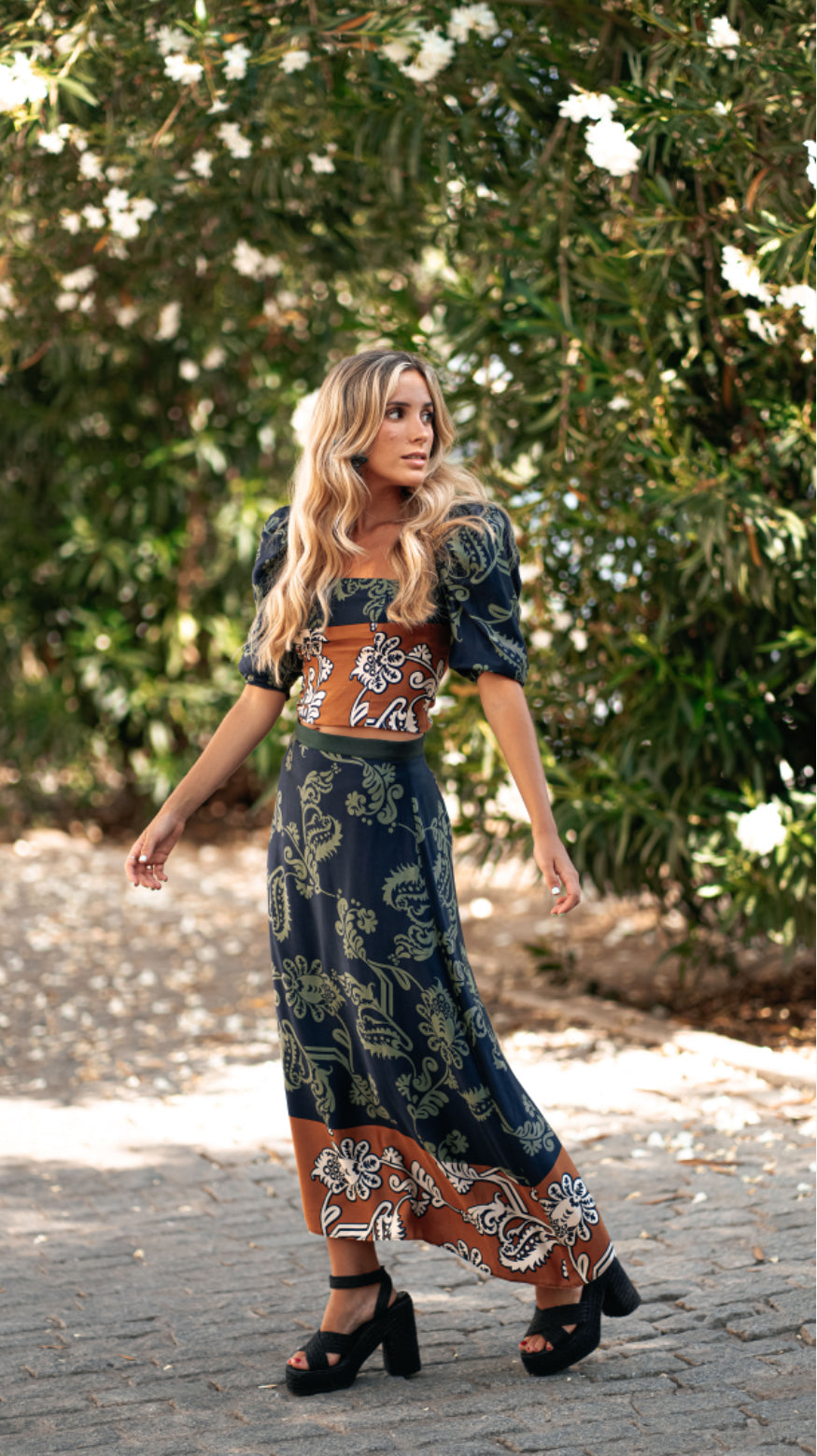 SOPHISTICATION IN DARK TONES The JADE dress combines the richness of floral prints with the elegance of dark tones . Crafted from a soft fabric, its design stands out for the contrast between deep blue and warm brown details . The square neckline and slightly puffed sleeves flatter the figure,...