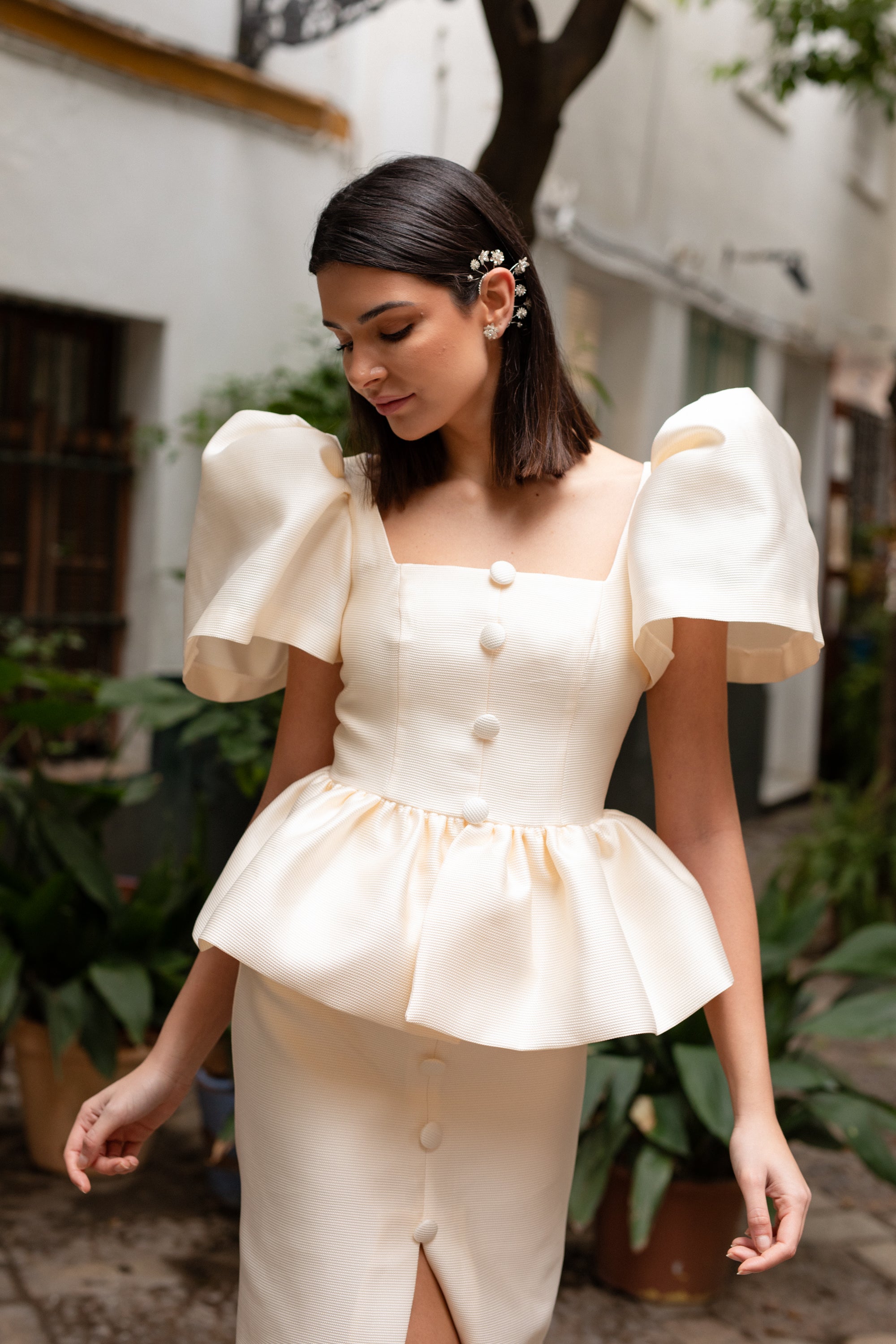 Vestido Candela en blanco marfil, una pieza sofisticada con escote cuadrado, mangas abullonadas y peplum marcado en la cintura. La falda midi con abertura frontal aporta elegancia y movimiento. Perfecto para eventos especiales y ocasiones donde quieras destacar con estilo.