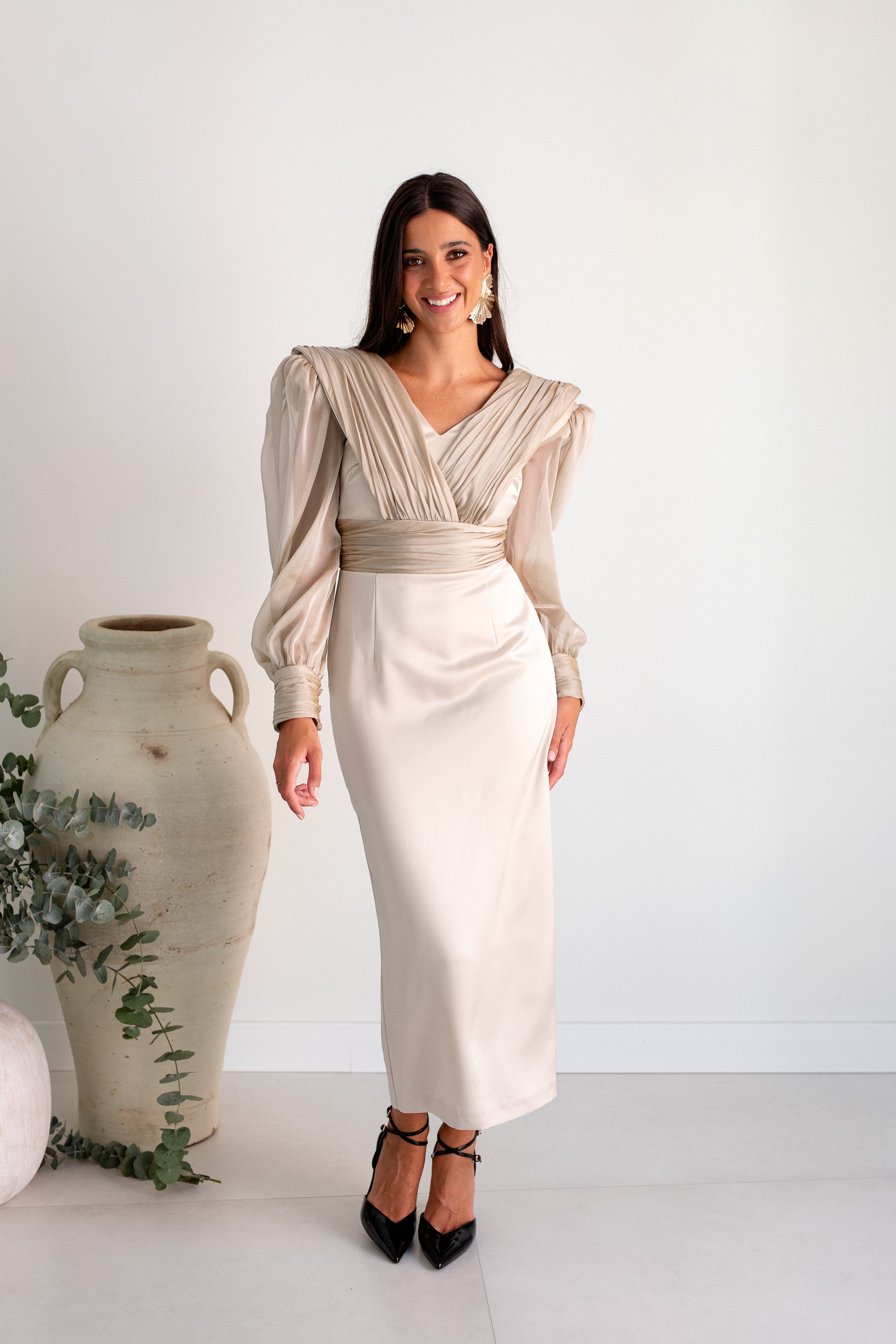 Raquel Dress - Dramatic elegance with a deep V-neck Fall in love with this spectacular champagne-colored dress that combines classic elegance with a touch of drama. The Raquel Dress is perfect for the woman seeking a sophisticated and memorable look for special events. Dress details: Deep V-neck at the back...