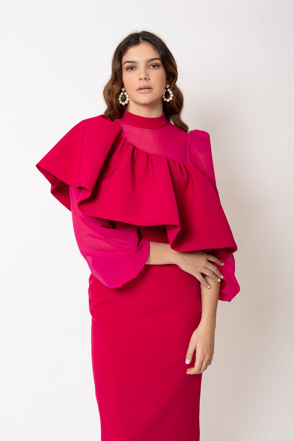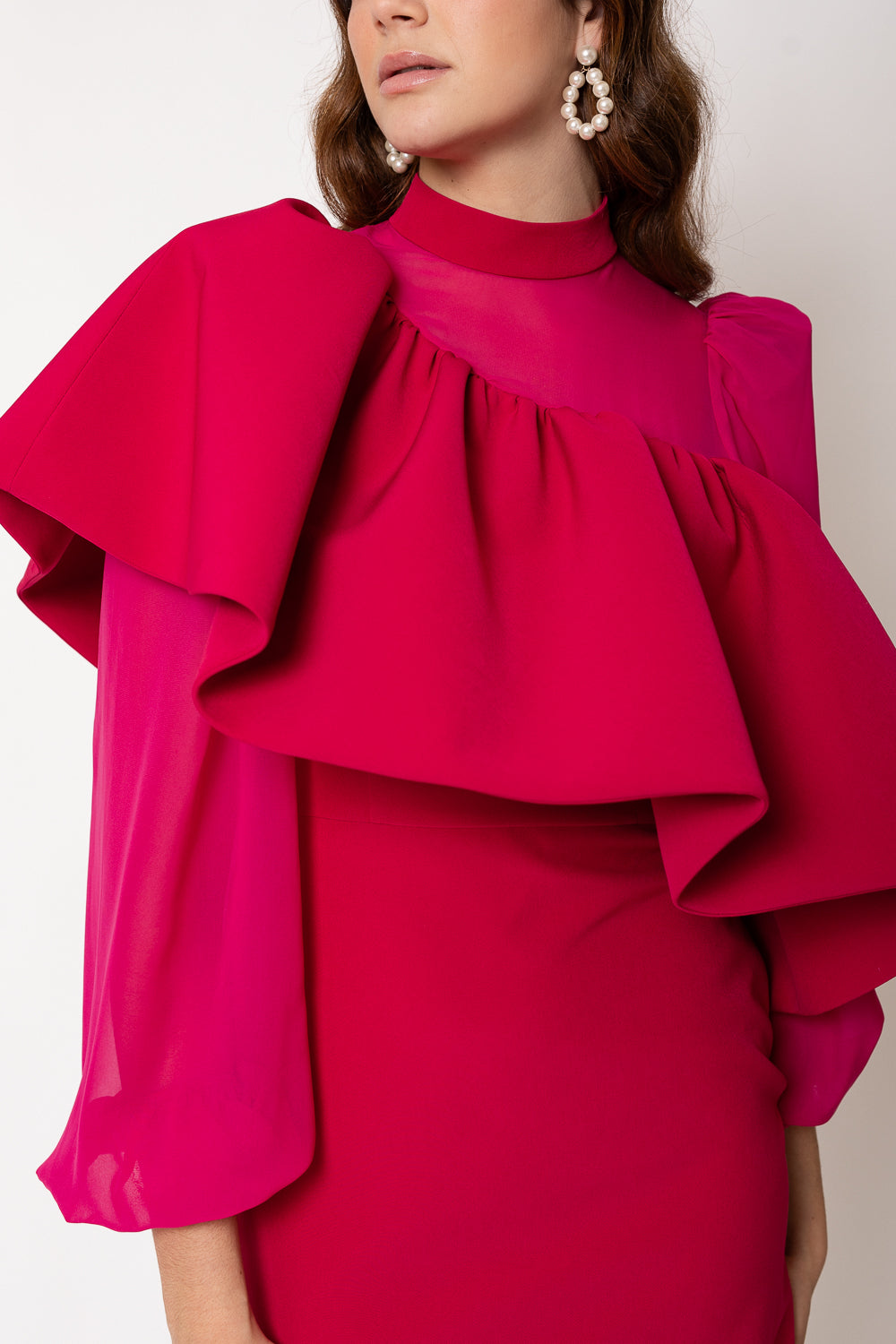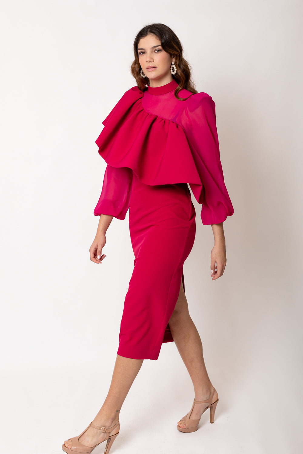 This Vega Volante midi dress features elegant chiffon sleeves that add a delicate and airy touch, while the asymmetrical ruffle detail lends a sophisticated and modern design. Perfect for special occasions, it combines feminine style with a silhouette that subtly and elegantly flatters the figure.